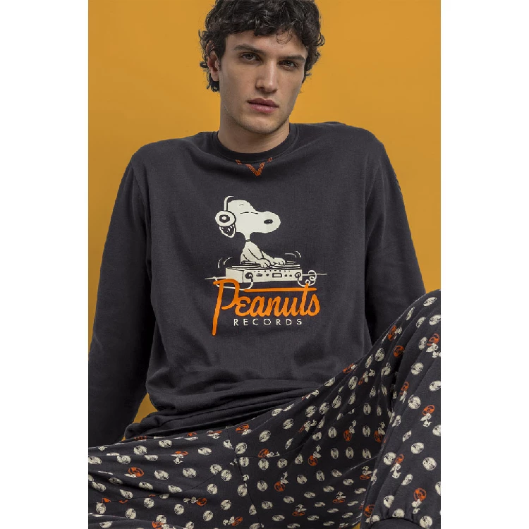 Pijama de hombre Peanuts 63013 de punto Interlock otoño-inviernoCamiseta manga larga, con cuello redondo, tiene un estampado en el pecho de SnoopyPantalón largo estampado completo y con puño Bolsillos trasero – Puños Camiseta y PantalónColor: MarengoPresentación en caja individual de la marca.Tallas: S, M, L, XL y XXLComposición: 100% algodón