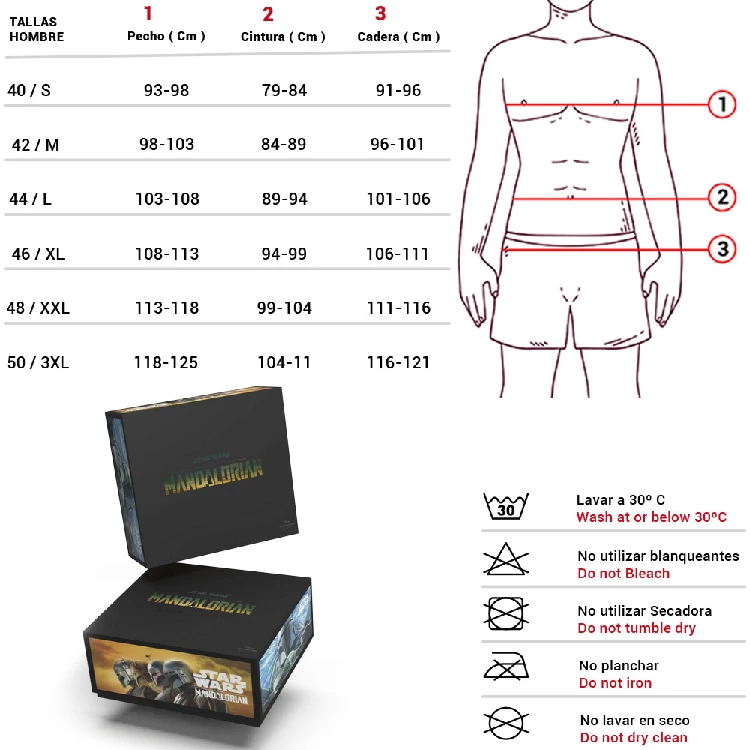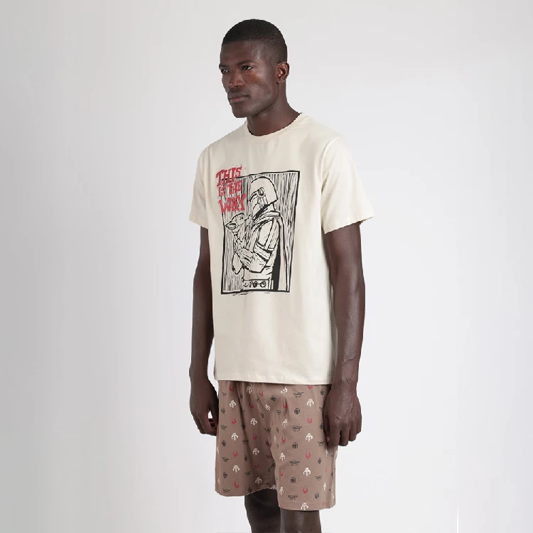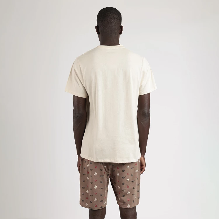 Pijama hombre Star Wars 63480 PuntoCamiseta de manga corta y cuello redondo con estampado en el pecho.Pantalón corto estampado completo y con bolsillo traseroPresentación: Caja individual con caja personalizadaColor: CrudoTallas: M, L, XL y XXLComposición: 100% AlgodónCombinan: ADM63480 y ADM63542