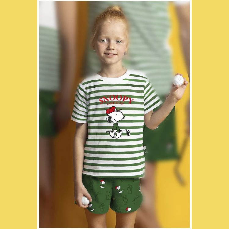 Pijama infantil niña Snoopy 64457 PuntoCamiseta de tirante ancho, con estampado y detalles en relieve.Pantalón corto estampado completo.Presentación: Caja individual con caja personalizadaColor: VerdeTallas: 4, 6, 8, 10, 12, 14 y 16Composición: 100% AlgodónCombinan: 64009, 64457, 64029 y 64448