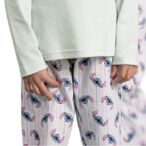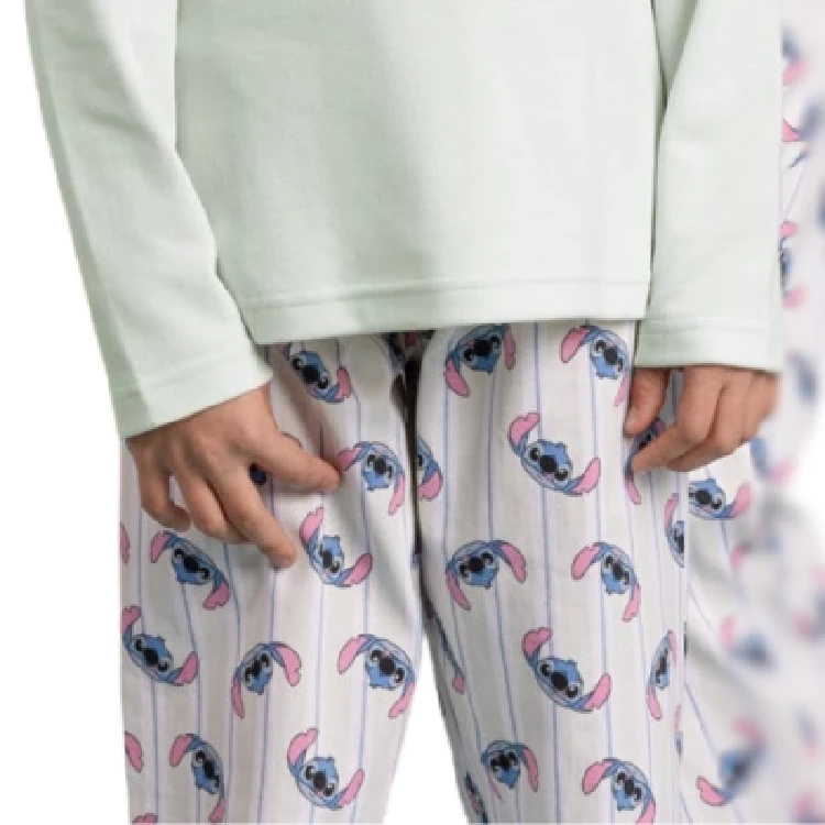 Pijama infantil niña Stitch 63262 Punto InterlockCamiseta de manga larga y cuello redondo con estampado en el pecho.Pantalón largo estampado completo.Detalles con brillo y raya estampada.Presentación: Caja individualColor: MentaTallas: 6, 8, 10, 12, 14 y 16Composición: 65% Poliéster y 35% algodón