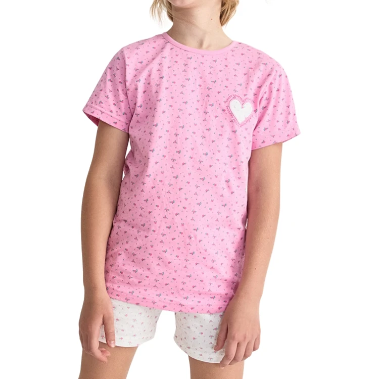Pijama infantil niña Talaman 26117554Camiseta de manga corta con cuello redondo estampado completa y con bordado en el pecho.Pantalon corto estampado completo.Presentación: Caja individualColor: RosaTallas: 8 ,10 y 12Composición: 100% Algodón