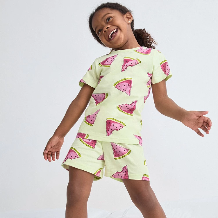 Pijama infantil niña Tobogan 26117558Camiseta de manga corta y cuello redondo con estampado completo de sandias.Pantalón corto estampado completo.Presentación: Caja individualColor: VerdeTallas: 8, 10, 12, 14 y 16Composición: 100% Algodón