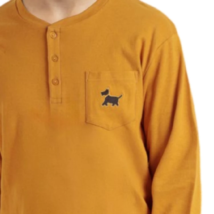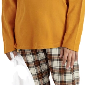 Pijama infantil niño Admas 63327 Punto InterlockCamiseta de manga larga y cuello abotonado, con 3 botones, bolsillo en el pecho con bordado.Pantalón largo estampado completo a cuadros.Presentación: Caja individualColor: MostazaTallas: 8, 10, 12, 14 y 16Composición: 100% Algodón