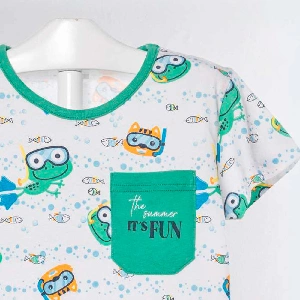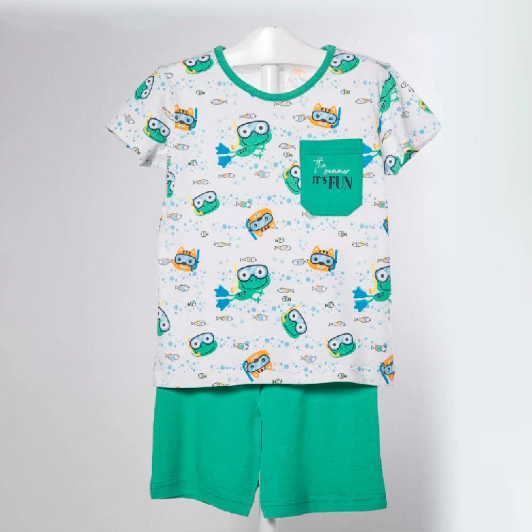 Pijama infantil niño KinaNit 120 AlgodónCamiseta de manga corta y cuello redondo con bolsillo en el pecho y estampado completo.Pantalón corto básico.Presentación: Caja individualColor: ÚnicoTallas: 2, 3, 4, 5 y 6Composición: 10% Algodón