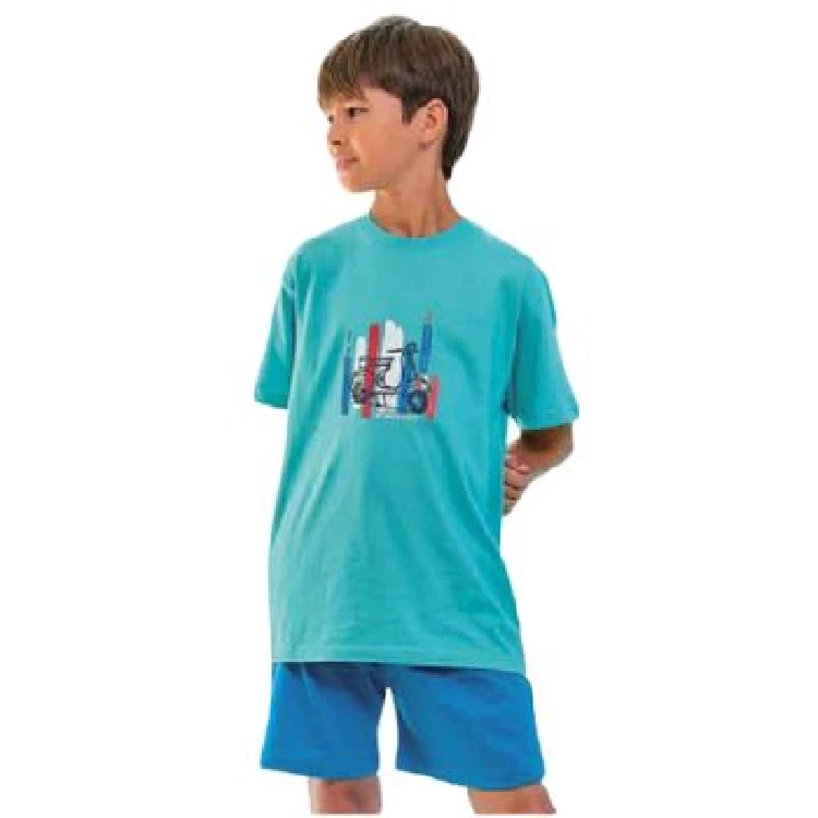 Pijama infantil niño Muslher 263011 Punto lisoCamiseta de manga corta y cuello redondo estampado en el pecho.Pantalón corto básico.Presentación: Caja individualColor: ÚnicoTallas: 8, 10, 12, 14 16 y 18Composición: 100% Algodón
