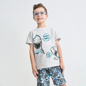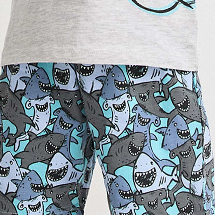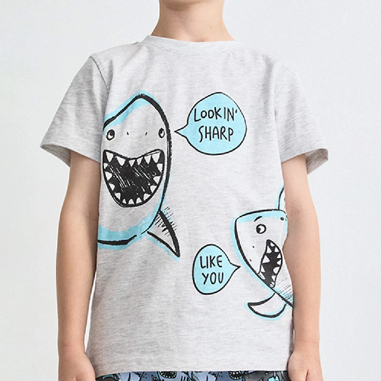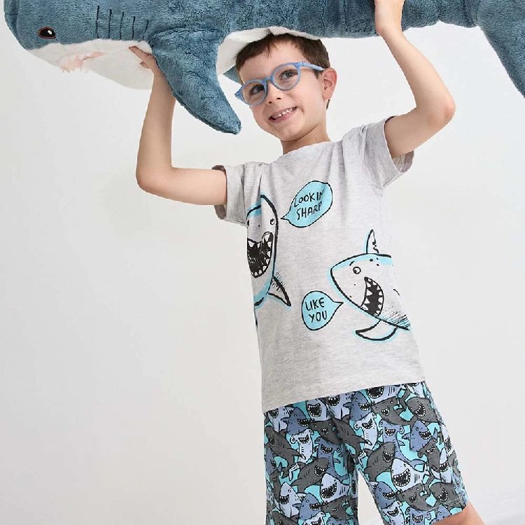 Pijama infantil niño Tobogan 26117001Camiseta de manga corta y cuello redondo con estampado en el pecho de tiburones.Pantalón corto estampado completo coordinado.Presentación: Caja individualColor: Gris vigore claroTallas: 2, 3, 4, 5 y 6Composición: 98% Algodón y 2% viscosa