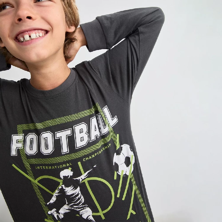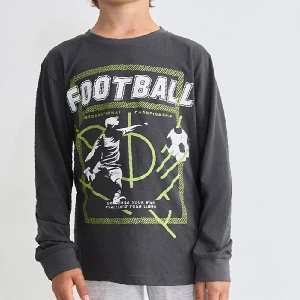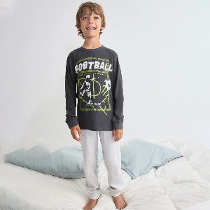 Pijama infantil niño Tobogan 26117534Camiseta de manga larga y cuello redondo con estampado de futbol y manga con puño.Pantalón largo básico.Presentación: Caja individualColor: AntracitaTallas: 8, 10, 12, 14 y 16Composición: 100% Algodón