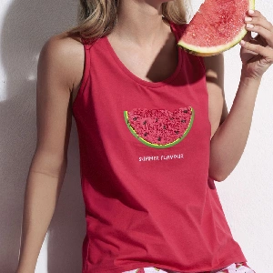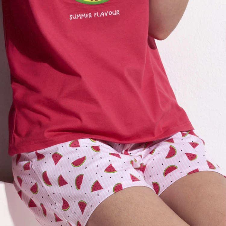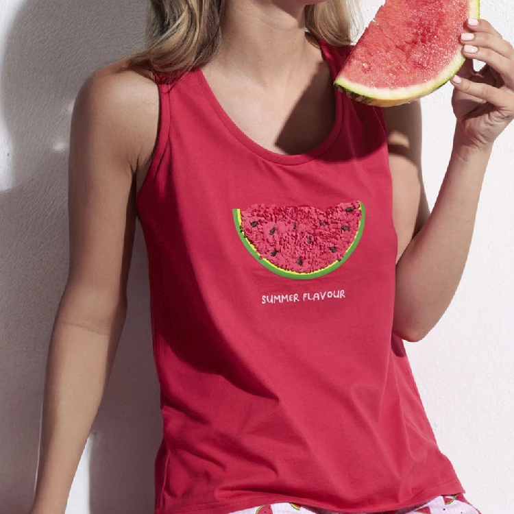 Pijama mujer Admas 64080 PuntoCamiseta de tirante ancho con un bordado especial de una sandía.Pantalón corto estampado completo.Presentación: Caja individual con caja personalizadaColor: Coral Tallas: S, M, L, XL y XXLComposición: 100% AlgodónCombinan: 64080 y 64081
