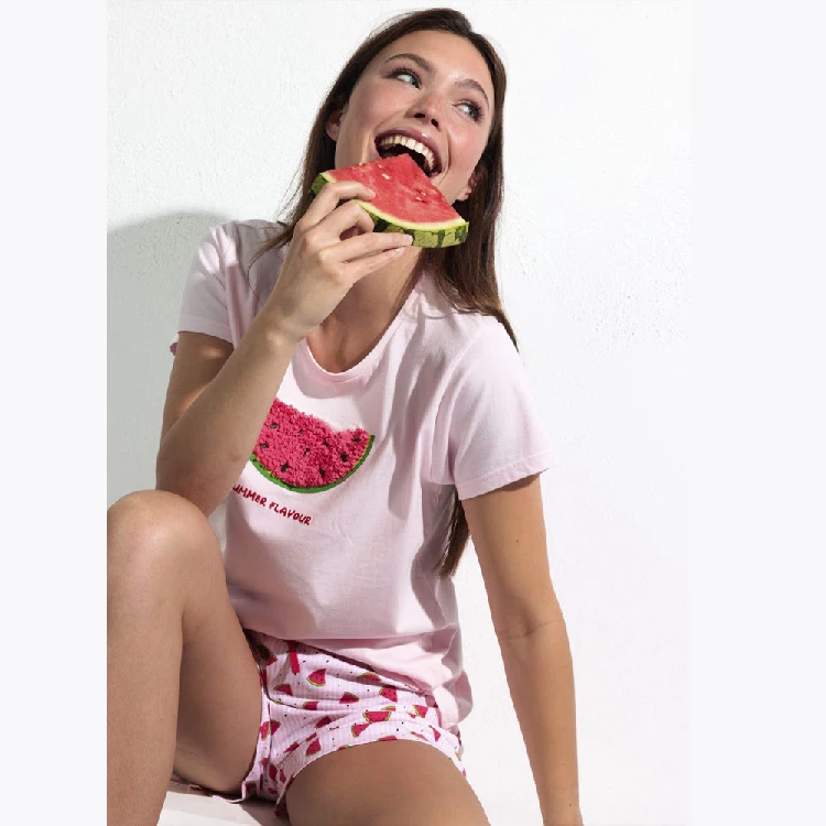Pijama mujer Admas 64081 PuntoCamiseta de tirante ancho con un bordado especial de una sandía.Pantalón corto estampado completo.Presentación: Caja individual con caja personalizadaColor: RosaTallas: S, M, L, XL y XXLComposición: 100% AlgodónCombinan: 64080 y 64081