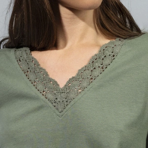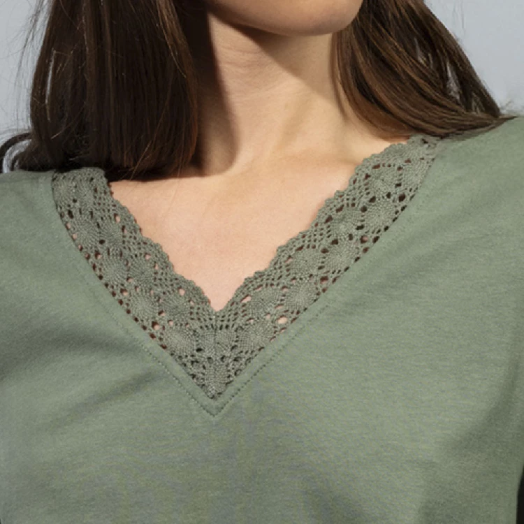 Pijama mujer Admas 64131 PuntoCamiseta de manga corta y cuello pico con puntilla guipur.Pantalón corto estampado completo.Presentación: Caja individual con caja personalizadaColor: Verde HojaTallas: S, M, L, XL y XXLComposición: 50% Algodón y 50% ViscosaCombinan: 61502, 64131 y 64593