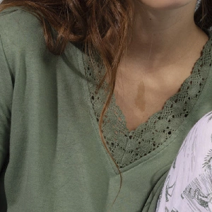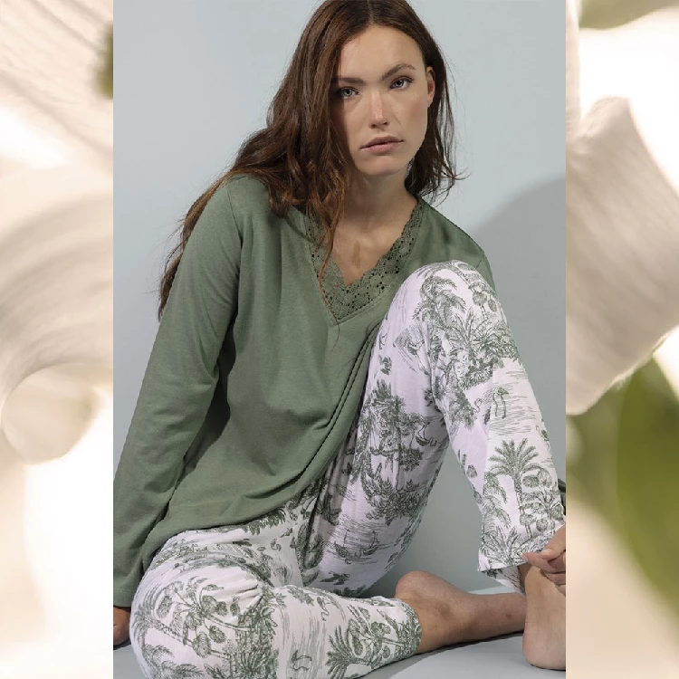 Pijama mujer Admas 64593 Punto SlubCamiseta de manga larga y cuello pico con puntilla guipur.Pantalón largo estampado completo.Presentación: Caja individual con caja personalizadaColor: Verde HojaTallas: S, M, L, XL y XXLComposición: 50% Algodón y 50% ViscosaCombinan: 61502, 64131 y 64593