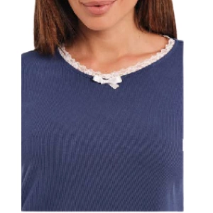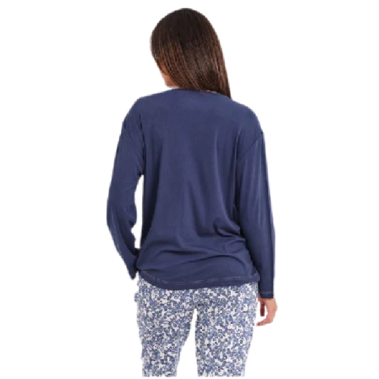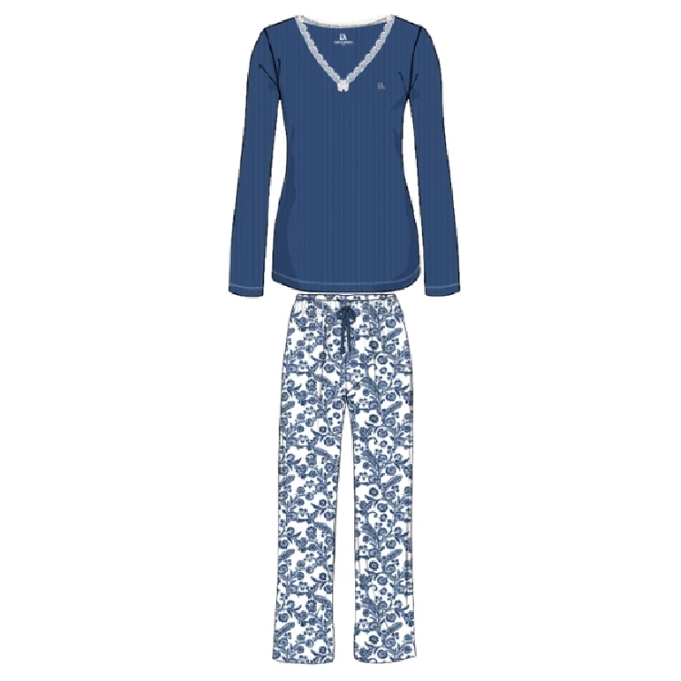 Pijama Mujer Don algodón DA25W405 interlock canaléCamiseta de manga larga y cuello de pico con puntilla a contraste, tejido canalé 5X1.Pantalón largo recto estampado floral al tono.Presentación: Caja individual personalizada de la marcaColor: AzulTallas: S, M, L, XL, XXL,Composición: Interlock 100% algodón