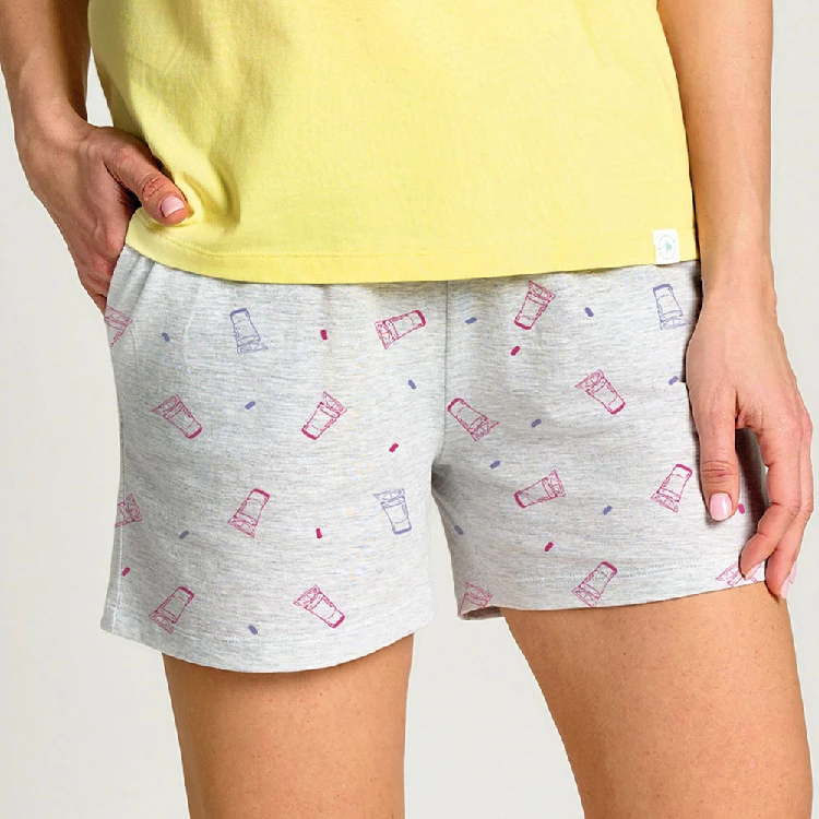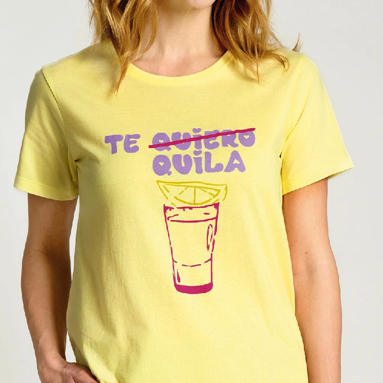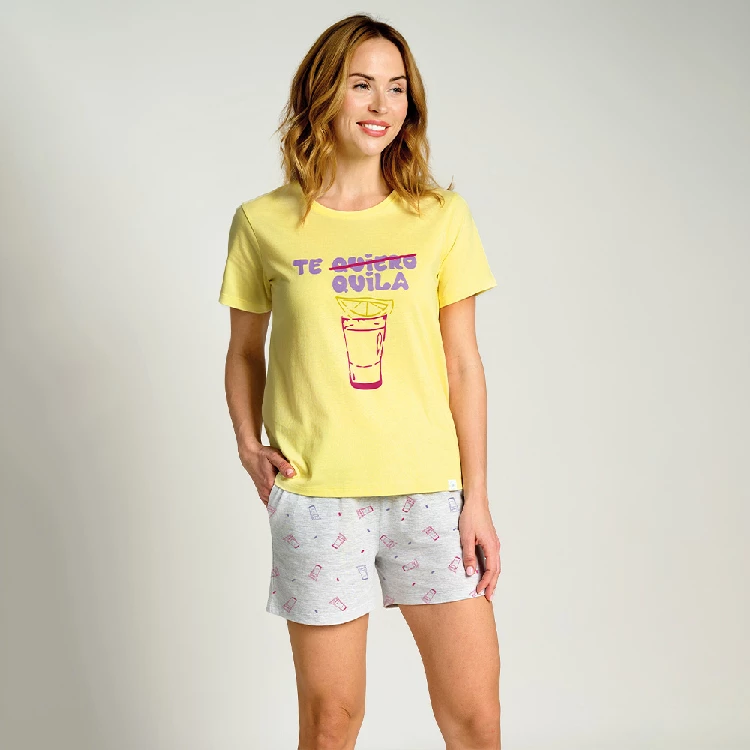Pijama mujer Muydemi 12071090 Camiseta de manga corta, cuello redondo, color amarillo claro con un gracioso estampado de tequila. Pantalón corto con estampado y bolsillos laterales y cintura elástica. Presentación: Bolsa individual de la marcaColor: ÚnicoTallas: S, M, L y XLComposición: 100% Algodón