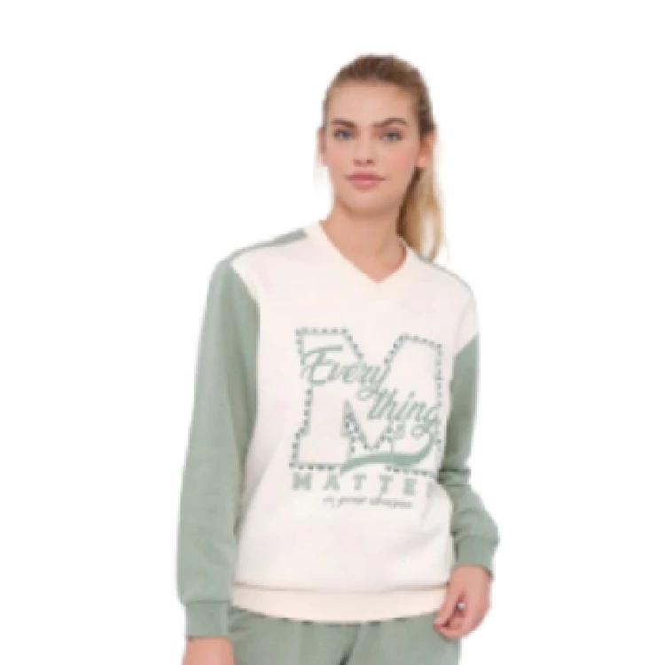 Pijama Mujer Muydemi 290045 FelpaCamiseta de manga larga y cuello pico con estampado en el pecho y con goma en los puños y cintura.Pantalón largo basico con lazo en la cinturilla, puños en el pantalón y bolsillos laterales. Presentación: Bolsa individualColor: ÚnicoTallas: XS, S, M, L, XL, 2XLComposición: Hecho de felpa, 80% Algodón - 20% Poliéster.