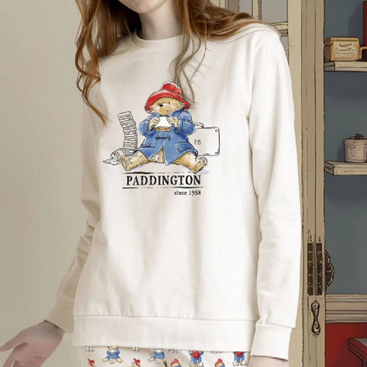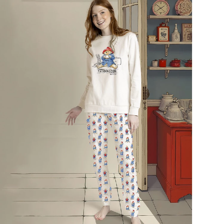 Pijama de Mujer Paddington 63860 de punto. Interlock, otoño-inviernoCamiseta manga larga, con cuello redondo estampado PaddingtonDetalle relieve – Puños camiseta y pantalónPantalón largo estampado completoColor: CrudoPresentación en caja individual de la marca.Tallas: S, M, L, XL y XXLComposición: 100% Algodón