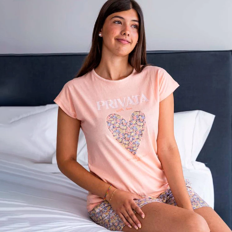 Pijama mujer Privata PV26416 Punto lisoCamiseta de manga corta y cuello redondo con estampado en el pecho.Pantalón corto estampado completo con bolsillos en los laterales.Presentación: Caja individualColor: ÚnicoTallas: S, M, L, XL y XXLComposición: Algodón, Punto liso