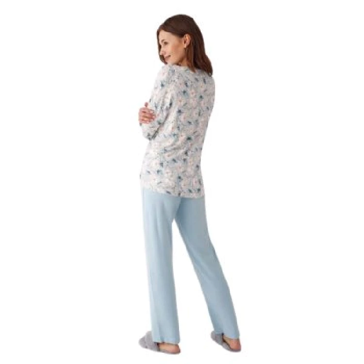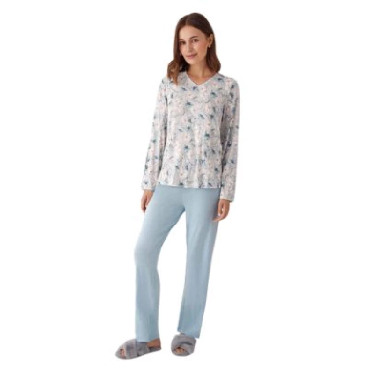 Pijama mujer Promise N19892 ViscosaCamiseta de manga larga y cuello pico con estampado completo.Pantalón largo básicoPresentación: Caja individualColor: Azul PastelTallas: XS, S, M, L y XLComposición: Viscosa