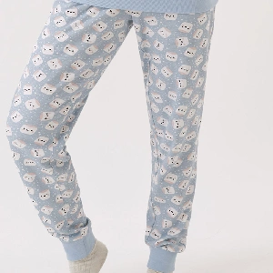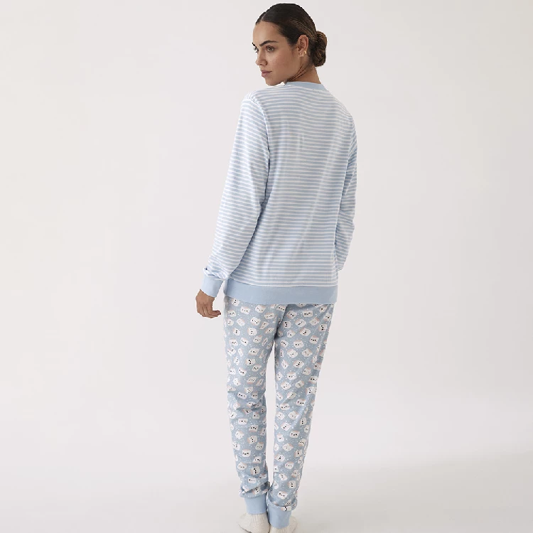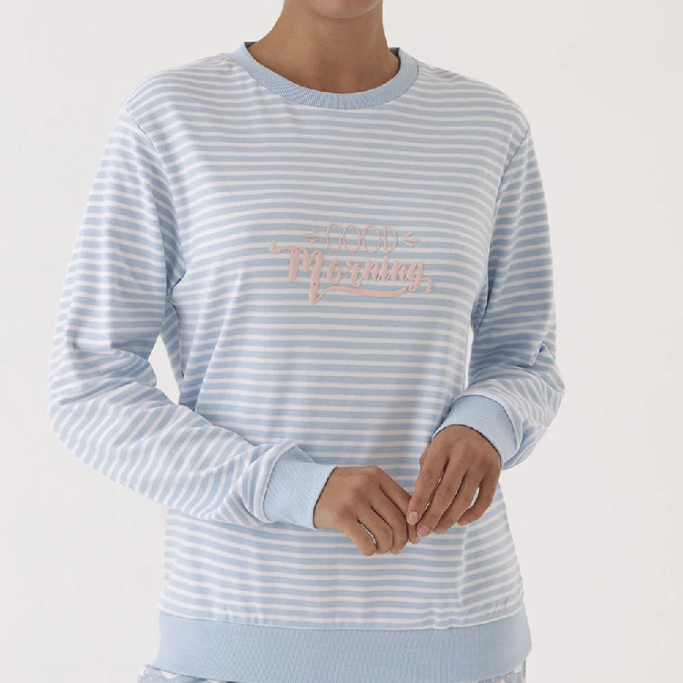 Pijama mujer Promise N20062 AlgodónCamiseta de manga larga y cuello redondo estampado a rayas, bordado en el pecho y manga con puño. Acabado interior suave.Pantalón estampado completo con puño.Presentación: Caja individualColor: Azul claroTallas: XS, S, M, L, XL y XXLComposición: 100% Algodón