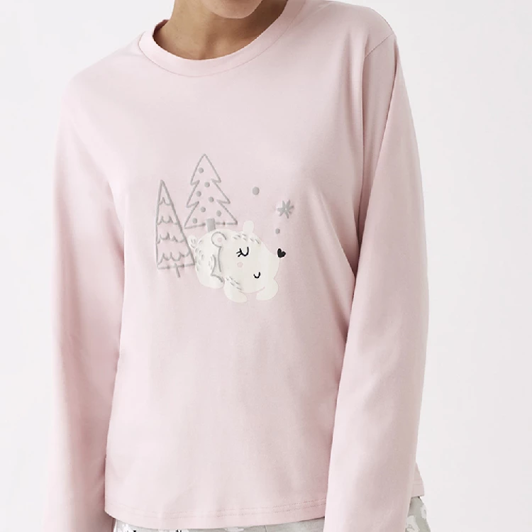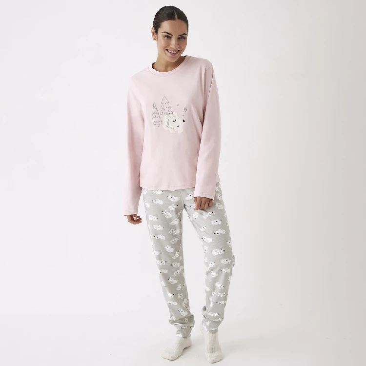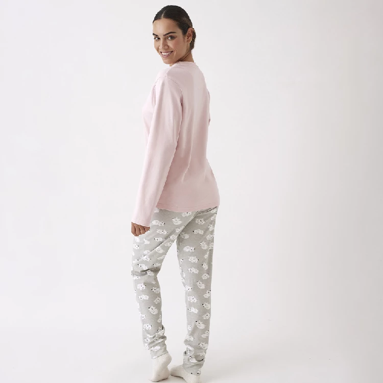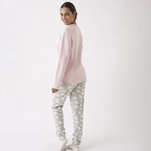 Pijama mujer Promise N20122 AlgodónCamiseta de manga larga y cuello redondo, bordado en el pecho y acabado interior suave.Pantalón estampado completo con puño.Presentación: Caja individualColor: RosaTallas: XS, S, M, L, XL y XXLComposición: 100% Algodón