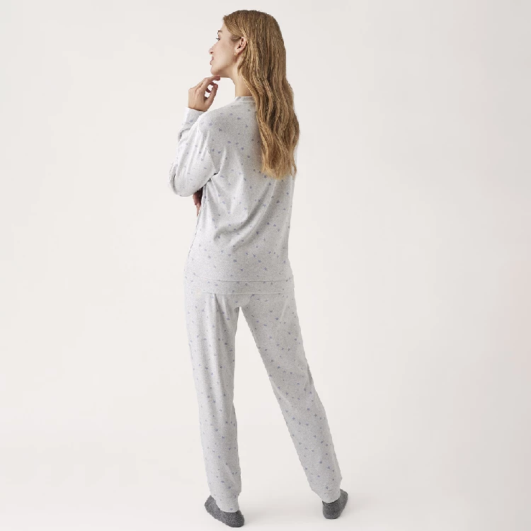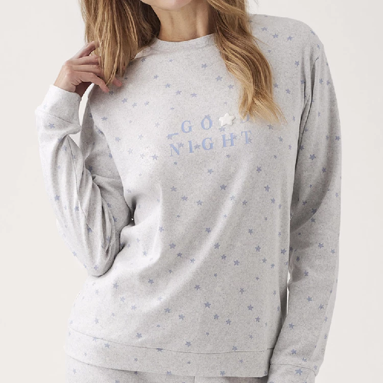 Pijama mujer Promise N20202Camiseta de manga larga y cuello redondo con estampado completo y con puño. hecho en algodón con acabado interior suave.Pantalón largo estampado completo con puño.Presentación: Caja individualColor: Gris vigoréTallas: XS, S, M, L, XL y XXLComposición: Algodón