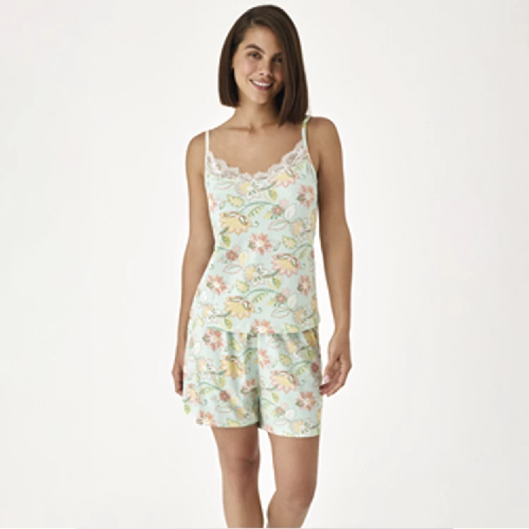 Pijama mujer Promise N21232 ViscosaCamiseta de tirante fino, con encaje de puntilla en el cuello y estampado completo.Pantalón corto estampado completo.Presentación: Caja individualColor: AcquaTallas: S, M, L, XL y XXLComposición: Viscosa
