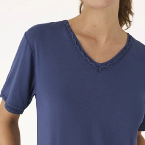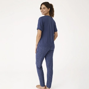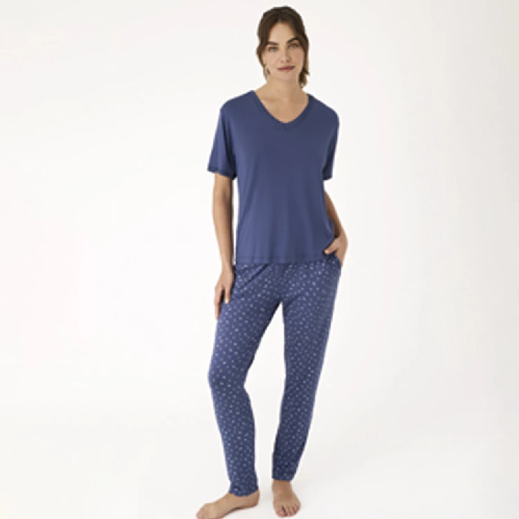 Pijama mujer Promise N21482 ViscosaCamiseta de manga corta y cuello pico con bordado y encaje.Pantalón largo estampado completo.Presentación: Caja individualColor: MarinoTallas: S, M, L, XL y XXLComposición: Viscosa