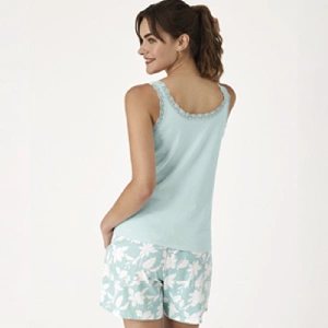 Pijama mujer Promise N21492 AlgodónCamiseta de tirantes y cuello tapeta con 3 botones y con encaje de puntilla.Pantalón corto estampado con bolsillos en los laterales.Presentación: Caja individualColor: TurquesaTallas: S, M, L, XL y XXLComposición: 100% Algodón