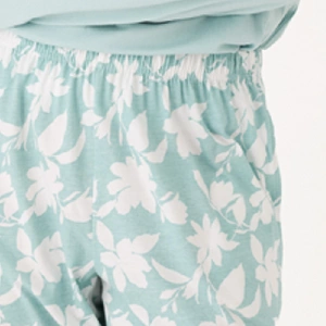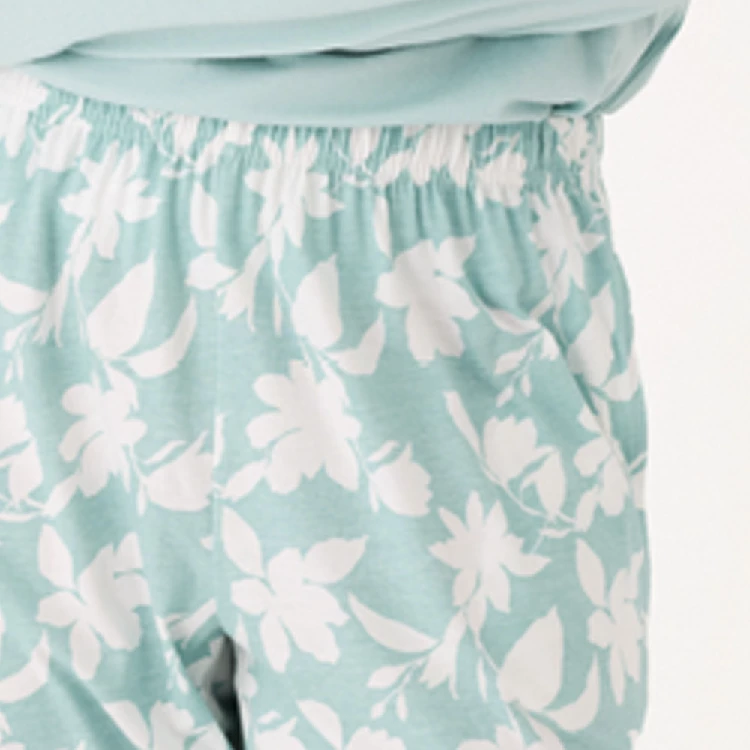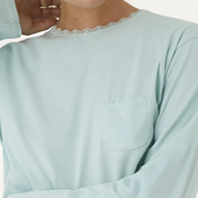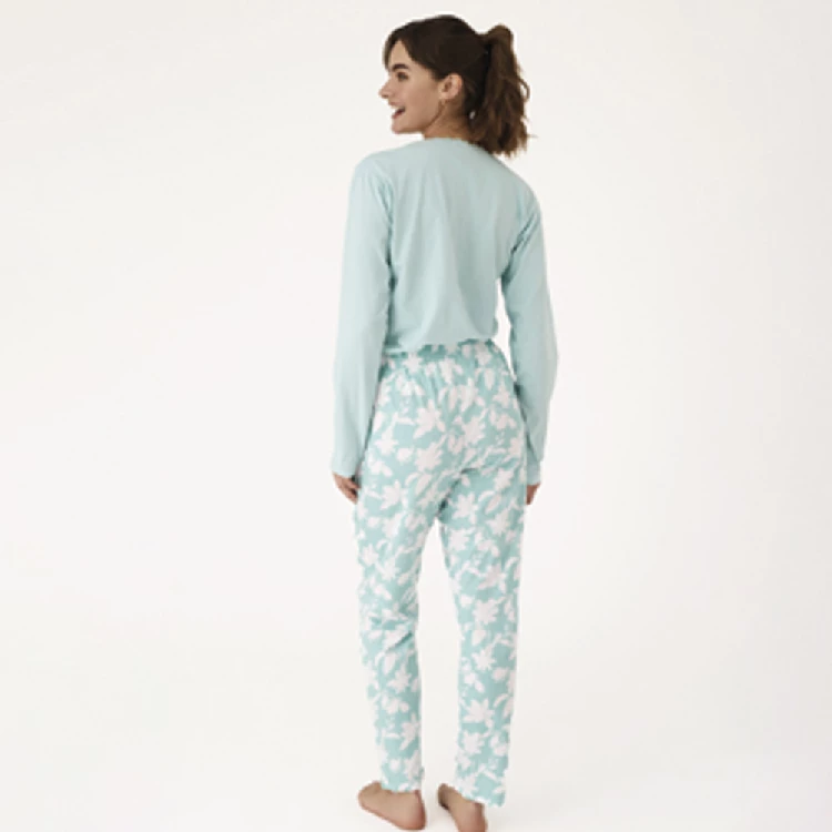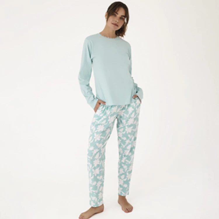 Pijama mujer Promise N21522 AlgodónCamiseta de manga larga y cuello redondo con puntilla de encaje.Pantalón largo estampado con bolsillos en los laterales.Presentación: Caja individualColor: TurquesaTallas: S, M, L, XL y XXLComposición: 100% Algodón