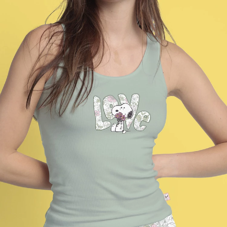 Pijama mujer Snoopy 64428 PuntoCamiseta de tirante ancho, con estampado en el pecho y en relieve. Hecho con tejido RIB.Pantalón largo estampo completo.Presentación: Caja individual con caja personalizadaColor: Verde hojaTallas: S, M, L, XL y XXLComposición: 100% Algodón