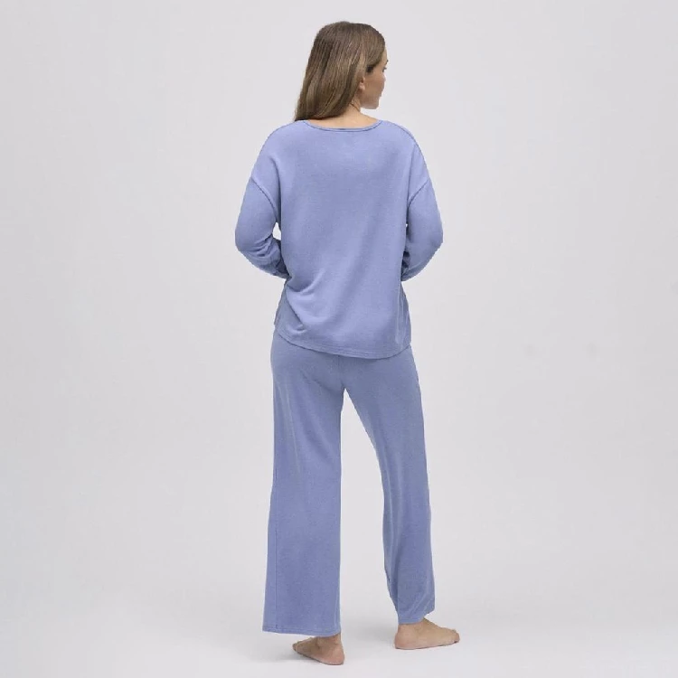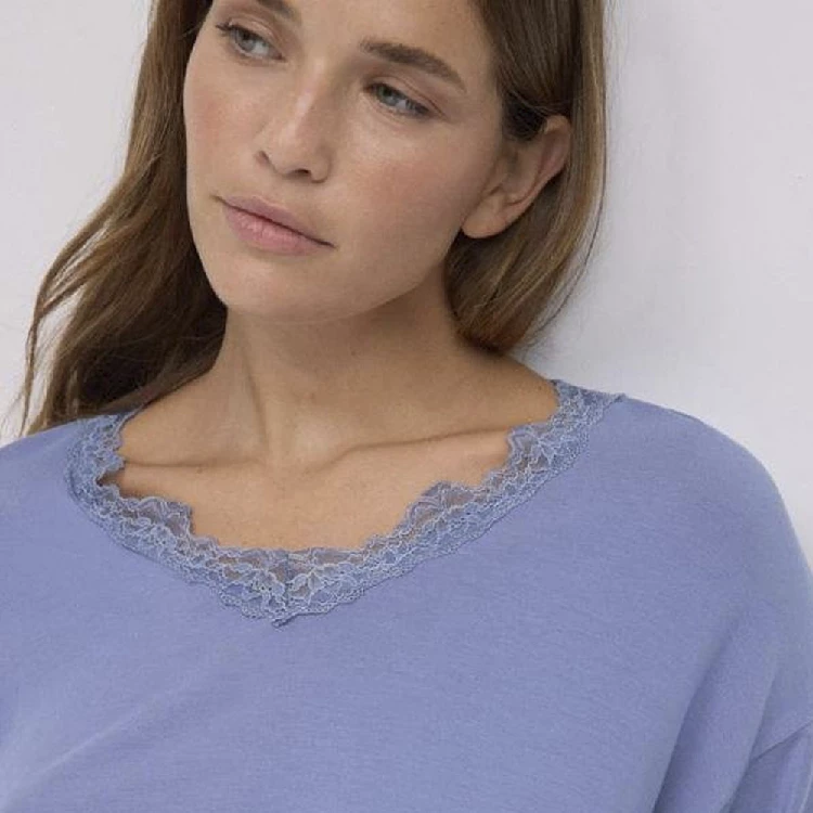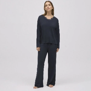 Pijama mujer Ysabel Mora 10773 Manga largaModelo cómodo para dormir con camiseta de manga larga y pantalón largo.Camiseta con escote pico y detalles de encaje.Presentación: Pack individualColor: Satin blue y negroTallas: S, M, L y XLComposición: 93% Modal y 7% Elastano
