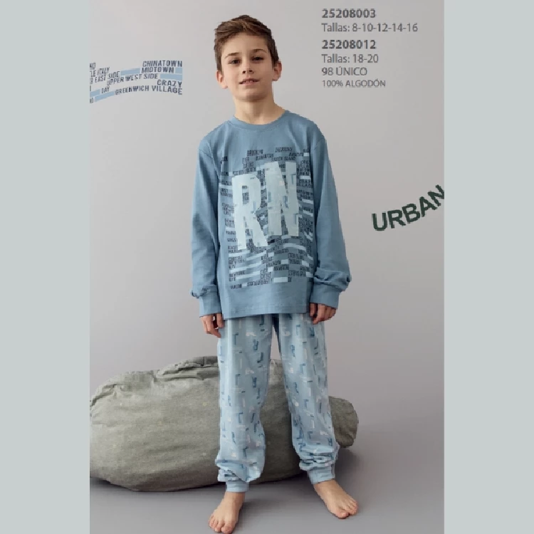 Pijama niño Tobogan 25208003 InterlockCamiseta de manga larga y cuello redondo con estampado en el pecho. Manga con puño.Pantalón largo estampado completo con puño.Presentación: Caja individual de la marcaColor: UnicoTallas: 8, 10, 12, 14 y 16Composición: 100% Algodón