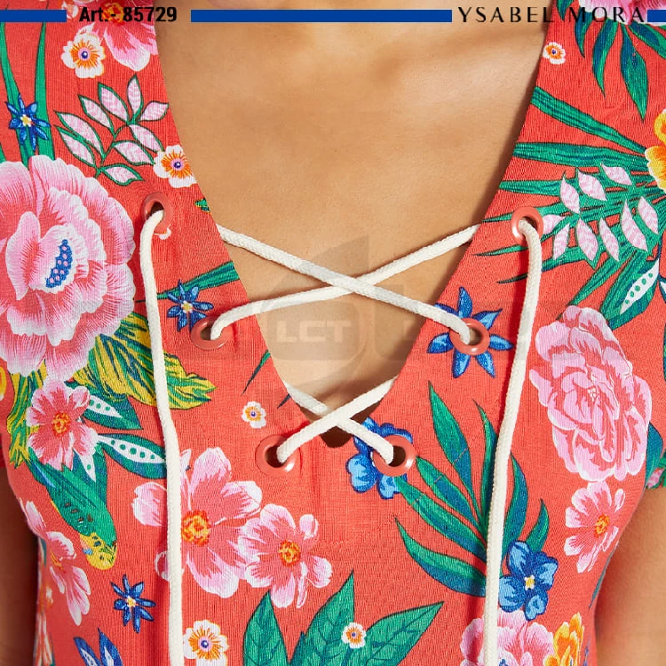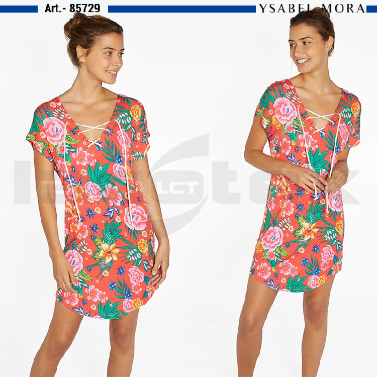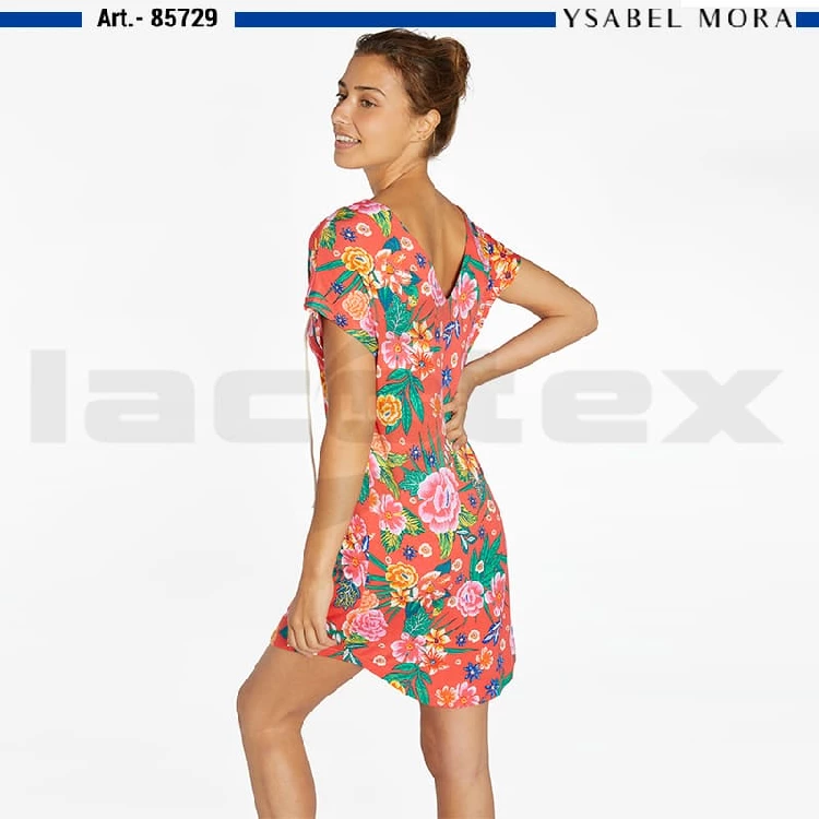 Vestido de mujer Ysabel Mora 85729 primavera-veranoModelo de media manga con cuello de pico abierto con cordón, fabricado en viscosa estampada.Modelo por encima de la rodilla.Colección: Living CoralPresentación: Caja individual de la marca personalizada con el modelo que contiene.Colores: ÚnicoTallas: S, M, L, XLComposición: 100% viscosa