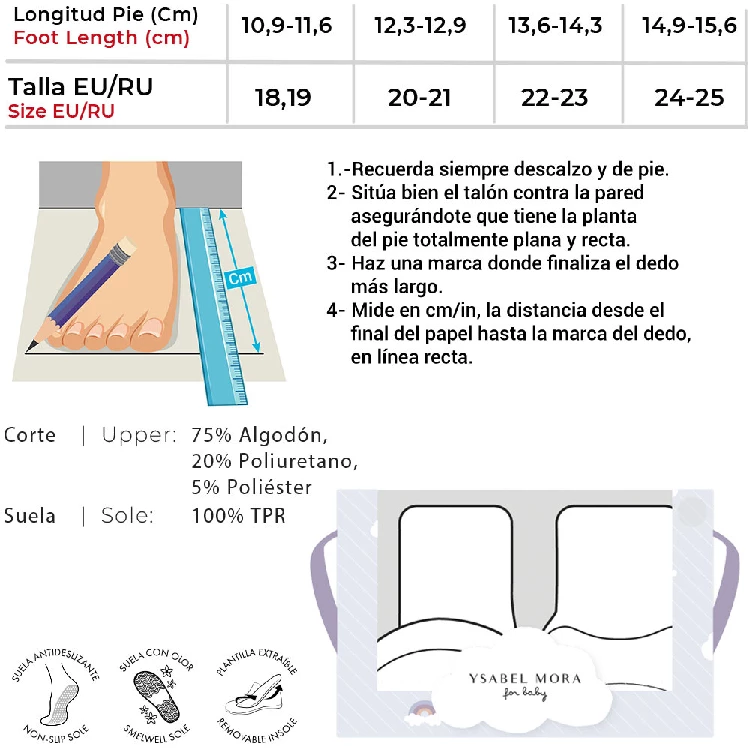 Zapatilla bebe Ysabel Mora 54041Modelo de casa estilo calcetín para bebé con una suela antideslizante que libera un aroma agradable.Presentación: Pack individualColor: Único Tallas: 18-19, 20-21, 22-23 y 24-25Composición: 75% Algodón, 20% Poliuretano, 5% Poliéster; Suela: 100% Caucho
